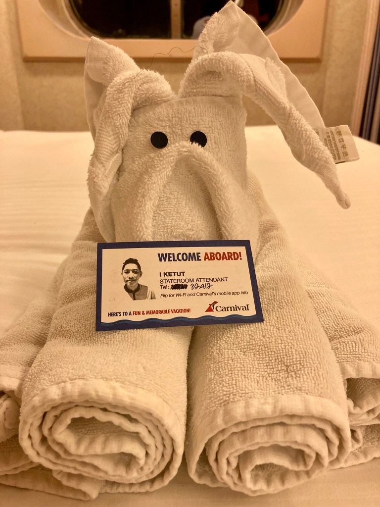 I had a few issues in my own cabin. Shortly upon arrival I realized that my mini-fridge had power (a light on), but it was not cooling at all. It appeared to be completely defrosted and warm to the touch. I notified my cabin steward when he introduced himself to me on that first afternoon, and while I was enjoying my fancy steakhouse dinner up on Deck 10 my mini-fridge was swapped out and replaced with one that actually cools. Oh – and my cabin steward left behind my first towel animal of the cruise: