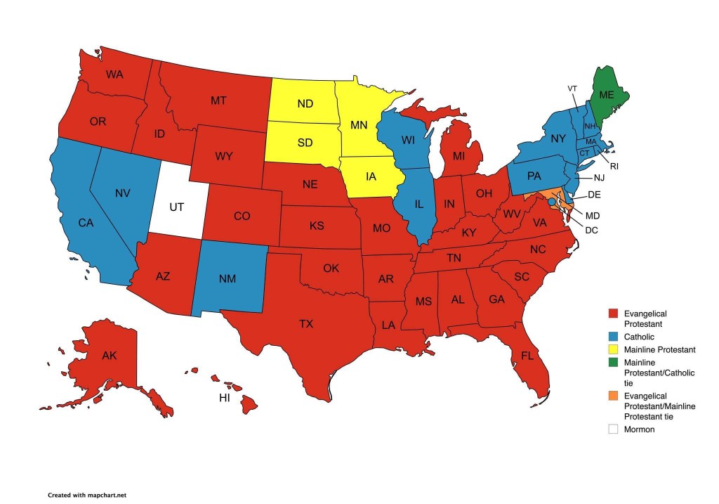Firstly – I was surprised that the map was overwhelmingly red – representing Evangelical Protestant. (That’s what I am – if you’re going to label me.)
