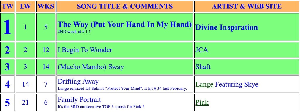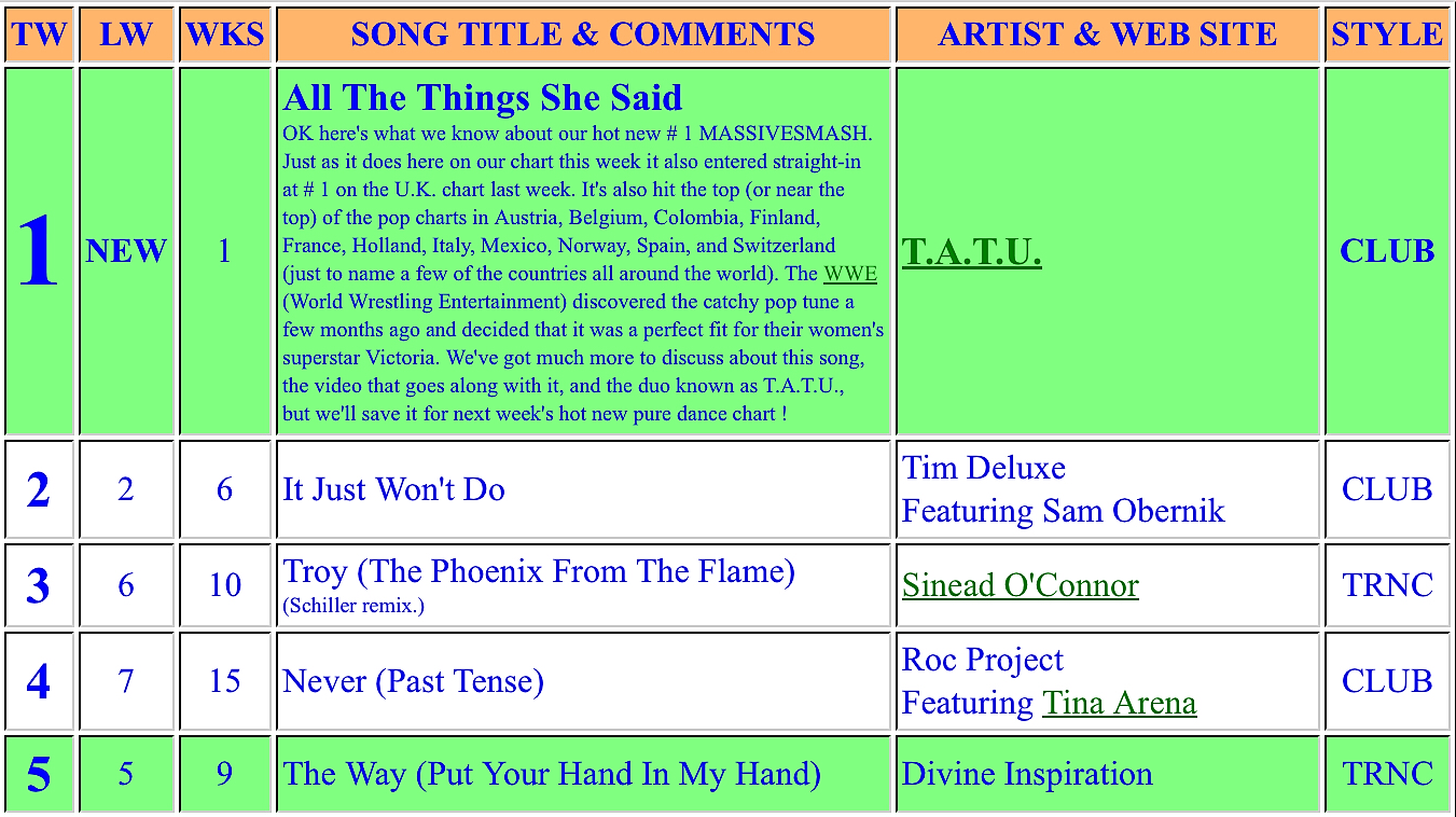 That’s from the 750TH overall edition and 391ST online edition of my weekly hit music chart – known at the time as my “Pure Dance Chart”. It was right in the middle of the 2ND era of my chart that lasted a little over 14 years from October 1995 to January 2010. For a little over 2 years from 2002 to 2004 I was immersed in the #EDM culture, and my chart reflected that short era of my life.